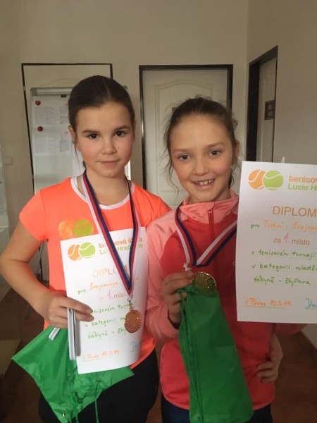 Julinka Tichá a Maruška Švejcarová - vítězství ve čtyřhře na turnaji mladších žákyň na Ldomácí půdě (březen 2019)
